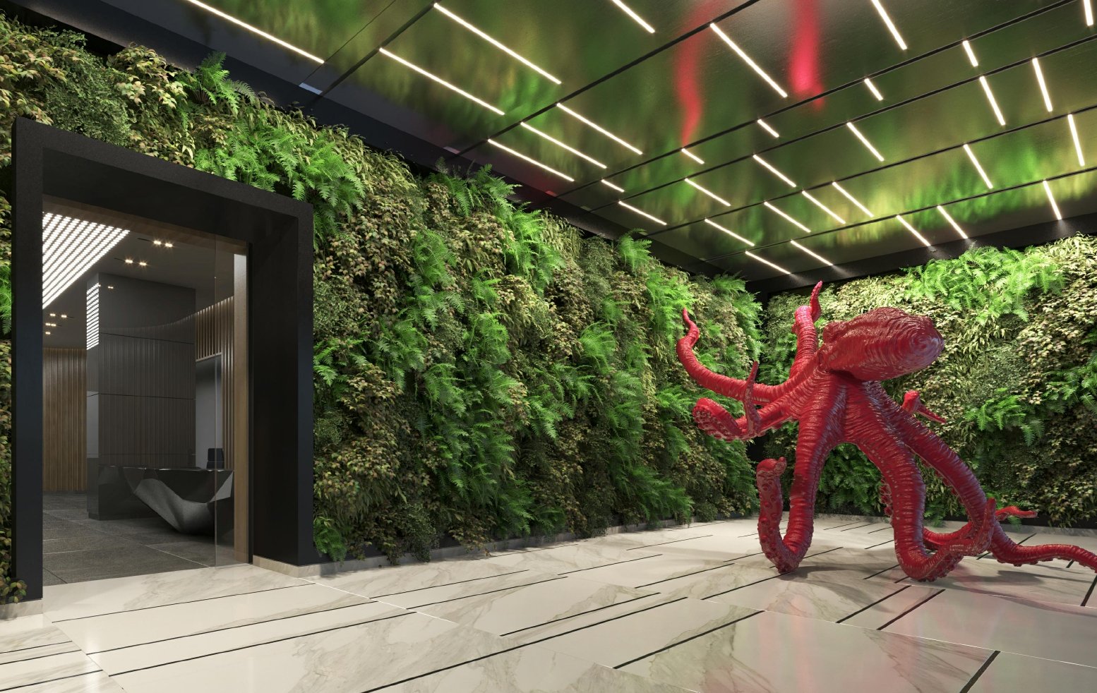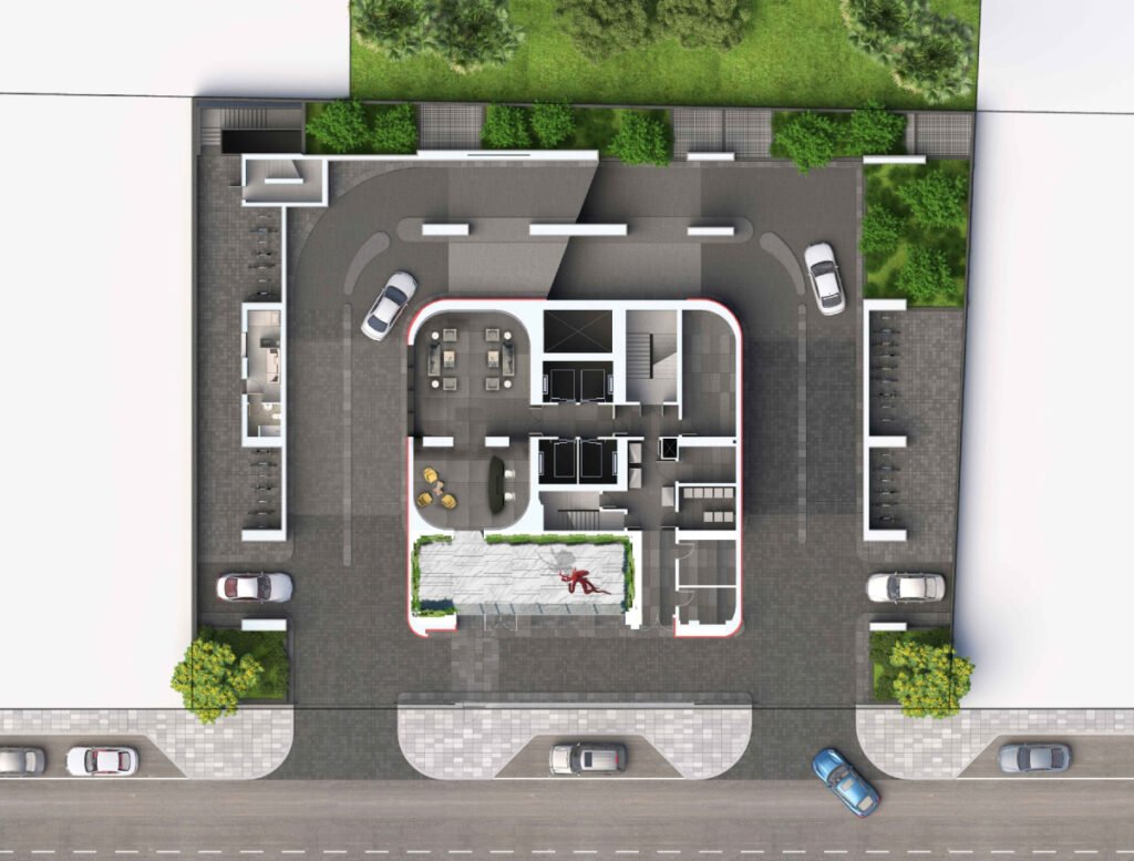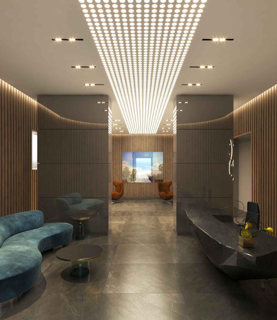 يشمل مدخل رئيسي فاخر، واستقبال، وكافيه ومطعم، إلى جانب خدمات مثل المصبغة، التوصيل، وغسيل السيارات.